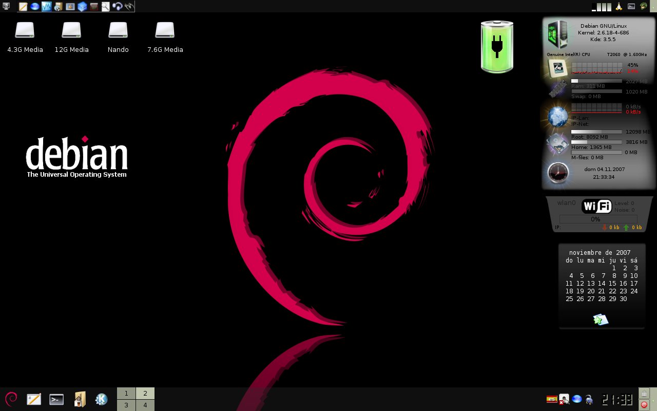 Como ven, tengo corriendo 4 temas de SuperKaramba: un monitor general del sistema (Aero Gr), un monitor Wi-Fi, un calendario y un monitor de batería (que generalmente cambia su posición a diario). Todos descargados de KDE-Look.org.