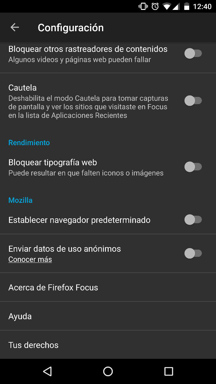 Entre las configuraciones podemos elegir bloquear o no distintos rastreadores, así como elegir el idioma y buscador. Las capturas de pantalla están deshabilitadas por defecto. Para habilitarlas debemos desactivar el modo "Cautela" en la configuración.