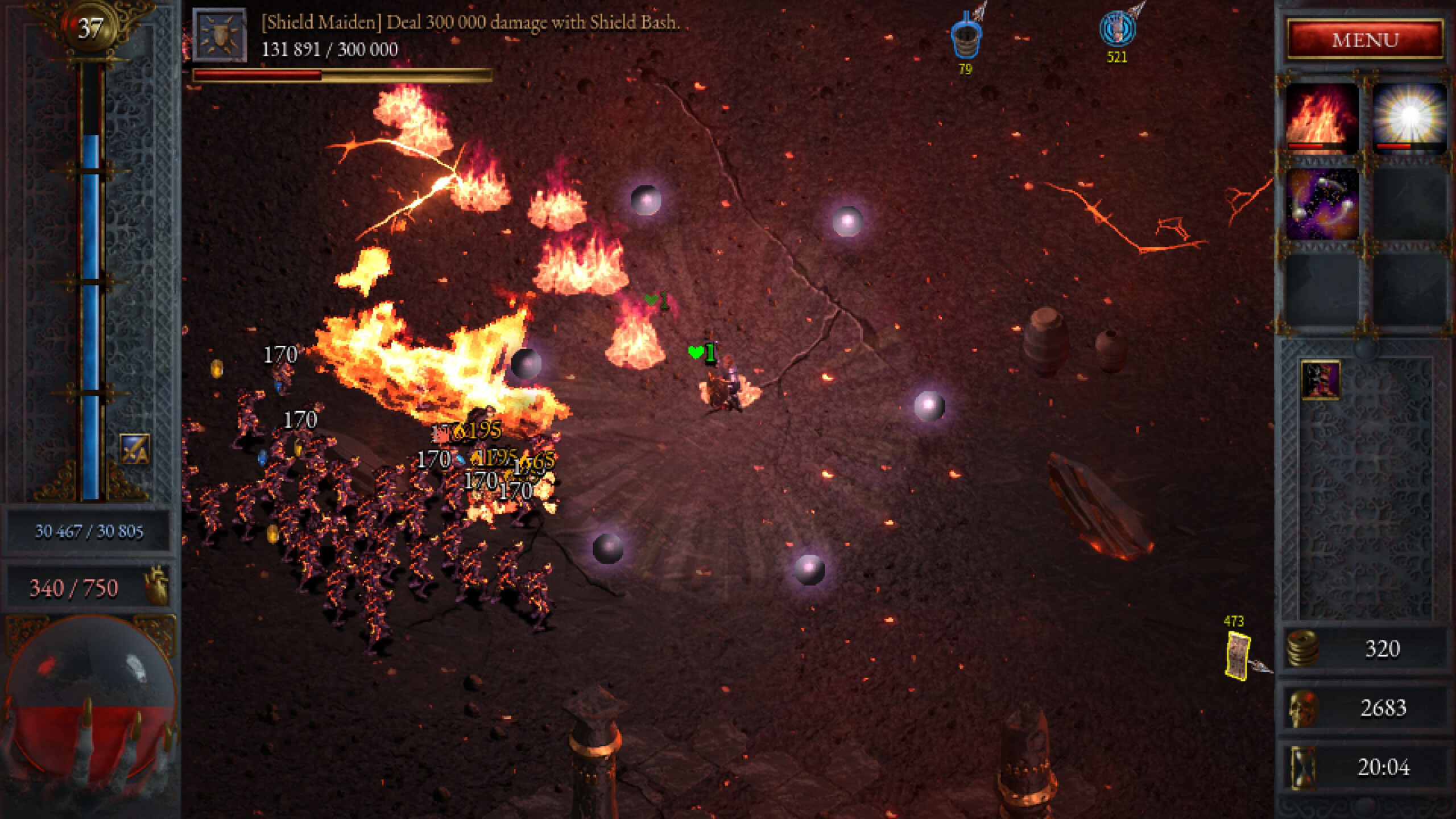 A medida que juntamos experiencia al eliminar hordas de enemigos, vamos subiendo de nivel (juntando los cristales que van dejando al morir). Podemos obtener equipamiento como botas, armadura y otras prendas, que mejoran las habilidades de nuestro héroe. También podemos comprar mejoras permanentes con el oro que vamos adquiriendo.