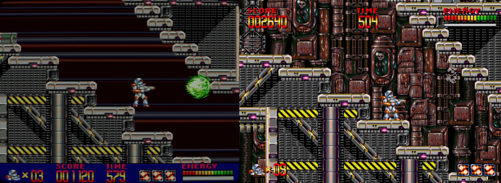 En Mega Turrican a la derecha se nota mucho más detalle en el diseño del nivel y el parallax de fondo.