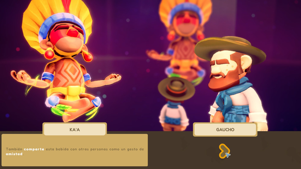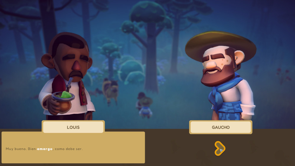 Podemos elegir entre un gaucho o una gaucha y personalizar su apariencia y ropas. También elegimos nuestros fieles compañeros un caballo y un perrito (y como todo juego de bien, podemos acariciar al perro). Jugué con un gaucho con decoraciones celestes, como homenaje a los colores de Uruguay. Es muy divertido escuchar las expresiones del gaucho mientras jugamos. Se expresa en portugués brazileño cuando ejecutamos acciones o interactuamos. Particularmente divertido el "que cagaço!" en cierto enfrentamiento, y los múltiples "¡Che!".