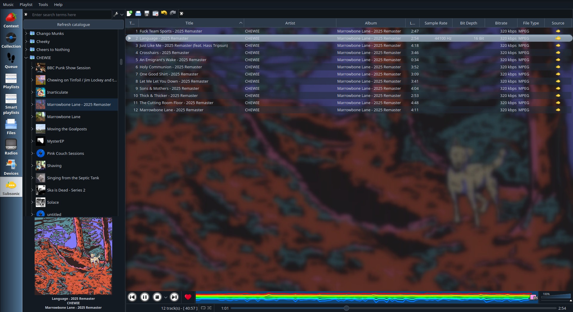 En la imagen se ve reproduciendo el disco Marrowbone Lane - 2025 remaster de la banda irlandesa CHEWIE. El disco Marrowbone Lane original salió en 2013 y es uno de mis preferidos. Lo tengo bastante memorizado, así que me resultó muy interesante escuchar el remaster y notar la diferencia en la mezcla. Me gustó mucho, se destacan particularmente algunos volúmenes que promueven más las harmonías en las voces, algunas voces adicionales y la parte final de la última canción donde el tema va creciendo hasta los 2:55 donde se siente más "grandioso" que en la versión original dándole un cierre más épico al disco. Es un remaster que no lo hace mejor (eso le quitaría métiro al disco original), es distinto, y eso está bueno. Las buenas canciones son disfrutables en cualquier mezcla (al menos buena).
